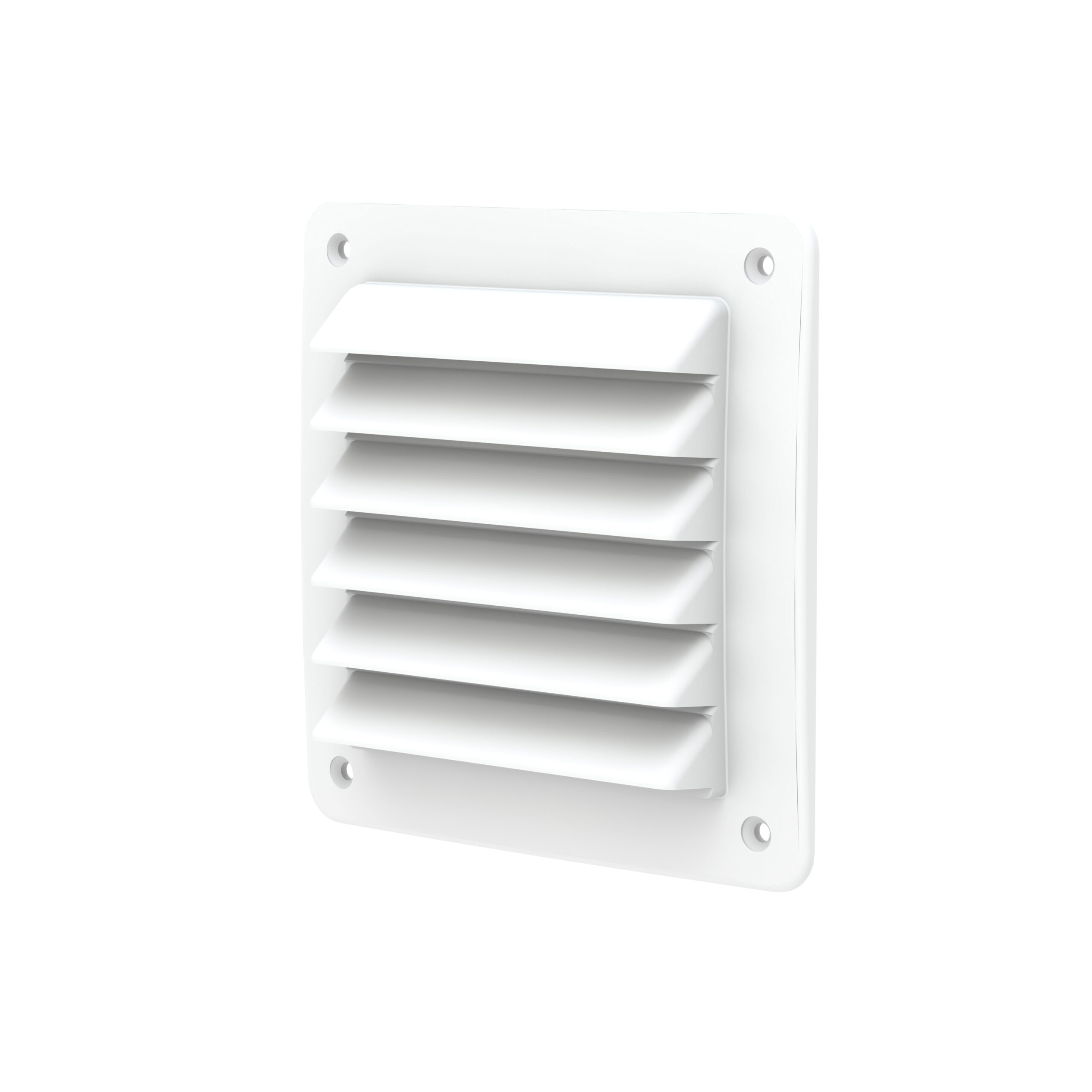 Rektangulärt ytterväggsgaller 150x150mm avsett att användas på utvändig vägg, försett med försänkta skruvhål för skruvmontage. Försett med snäppfäste till väggenomföringsstosar. Gallret tillverkas i PP (polypropen) med låg miljöpåverkan.