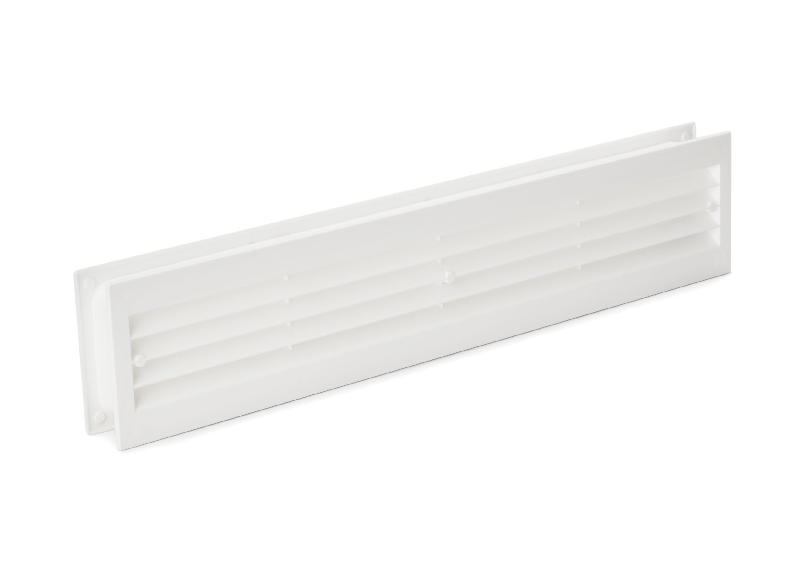 Överluftsdon i vitt för placering över spalt eller hålrad. Består av två plana galler för horisontell montering. Rektangulärt dubbelsidigt överluftsdon. Håltagningsmått 435×77 mm.